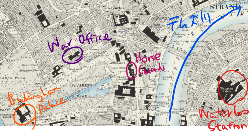 少し前まで(1858年まで)、Horse Guardsっていう建物が陸軍省だったんだが、以下の紫ペンの場所に移転したぞ。