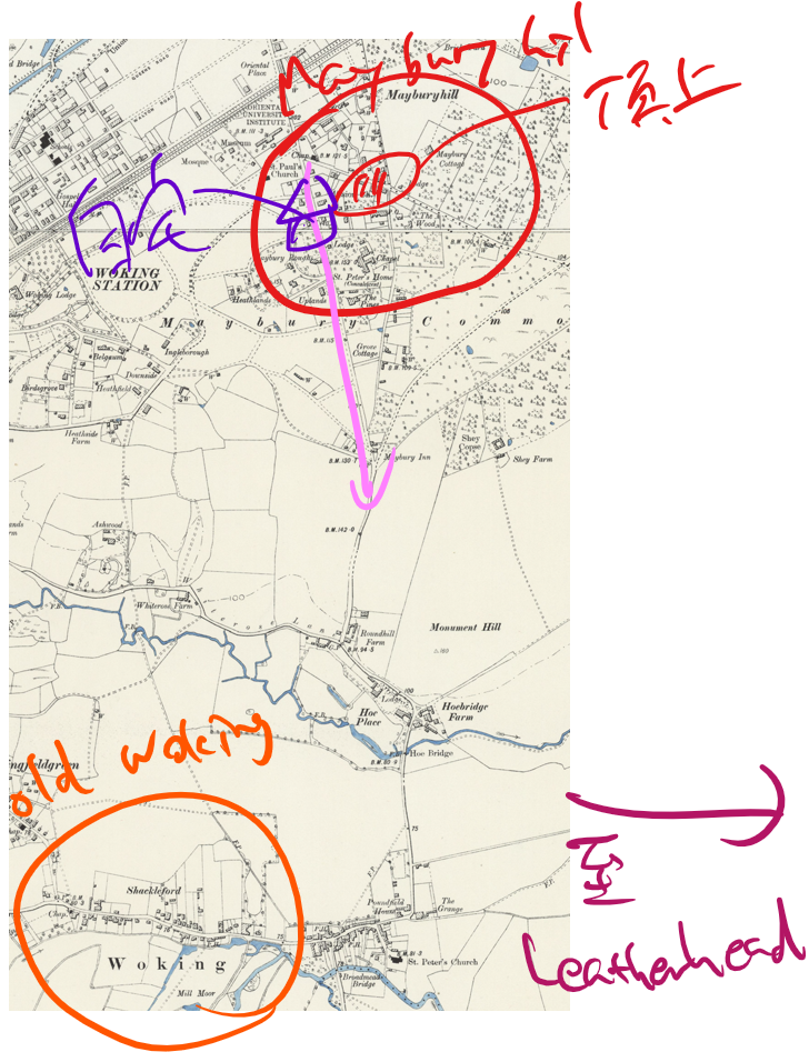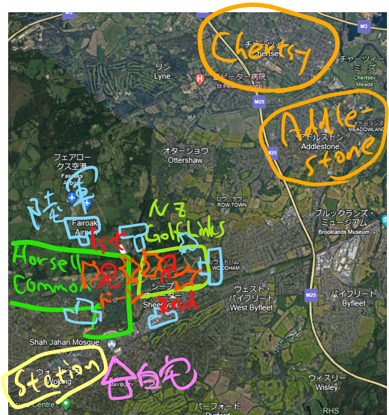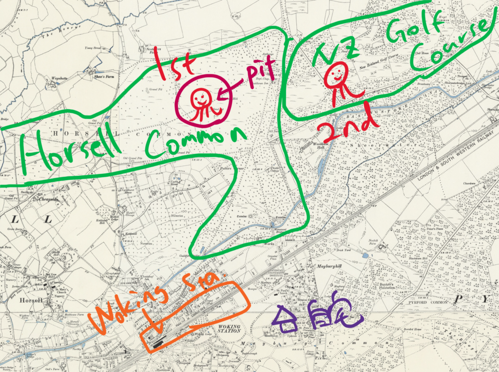 OS社の古地図を見る限り、「Golf Links」は、Horsell Commonの東側の「New Zealand Golf Course」のみ。その後の展開的にもここでほぼほぼ問題ないと思うわ。