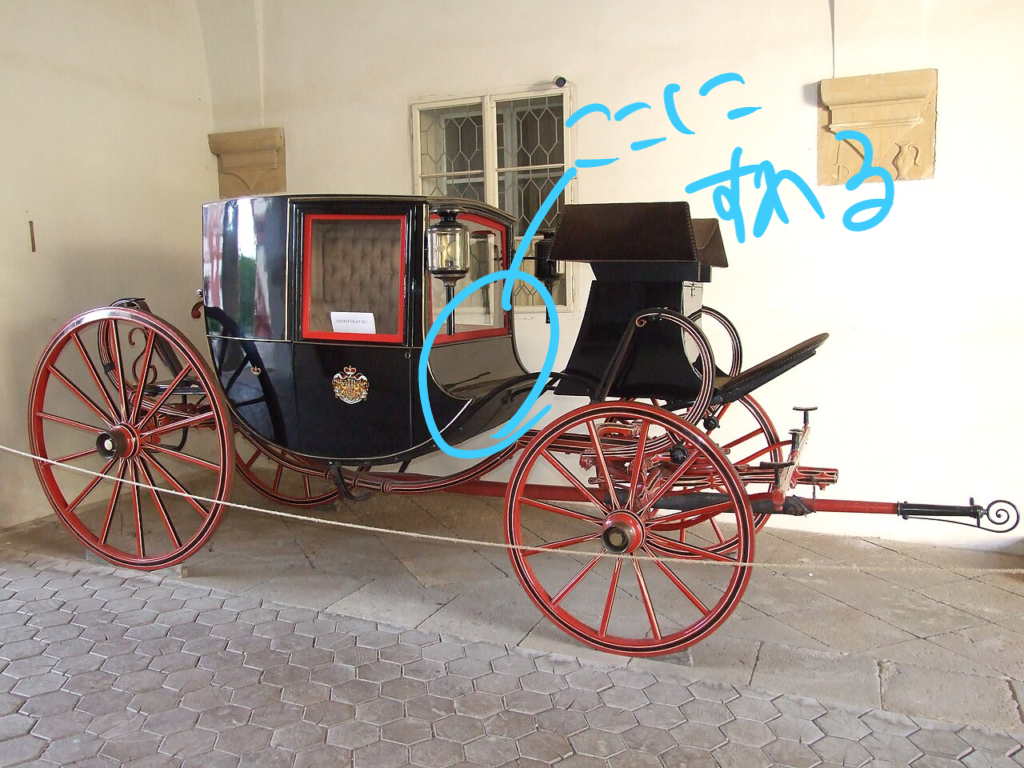 四輪馬車の一種で、荷台(後部座席)の車体の前方が曲がってて、そこに運転手が座る(運転手は屋外)っていう馬車。19世紀初めに流行したのよ。