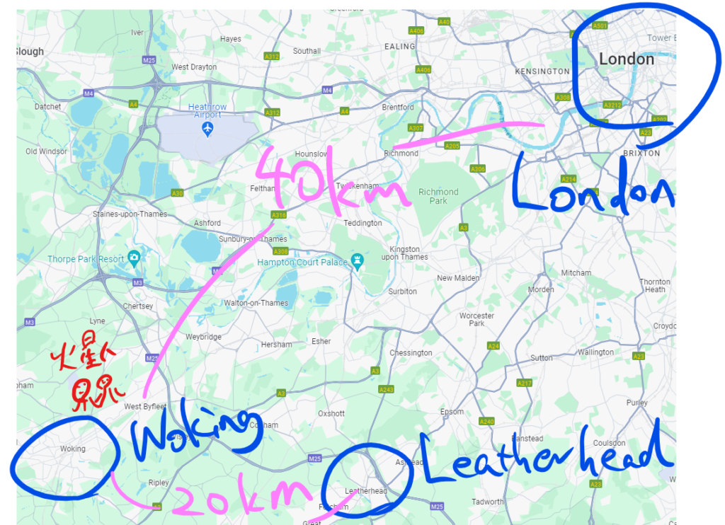 自宅を発ち、奥さんのいとこがいるLeatherhead(南東方面・そこそこ遠い)に向かってるところだったね。