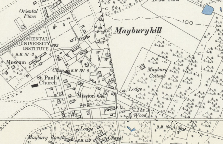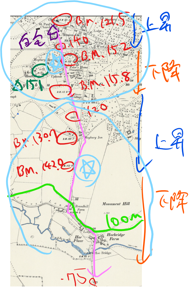1個目の丘(Maybury Hill)の頂上は三角点のところ(△151)で、2個目の丘(Monument Hill)の頂上はB.M.142.0のところかな。上地図では水色の星マークをつけてあるわ。